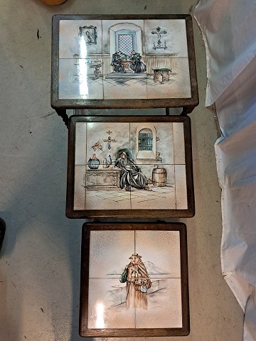 3 Indskudsborde i massivt egetræ med kakler, fra 19330erne.