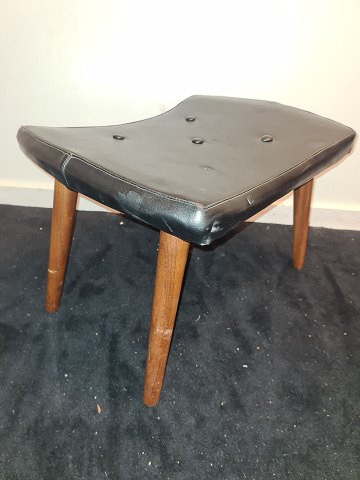 Læderbetrukket fodskammel med ben i teak. Fremstår stabil og ok pæn dog med manglende knap. (billede)