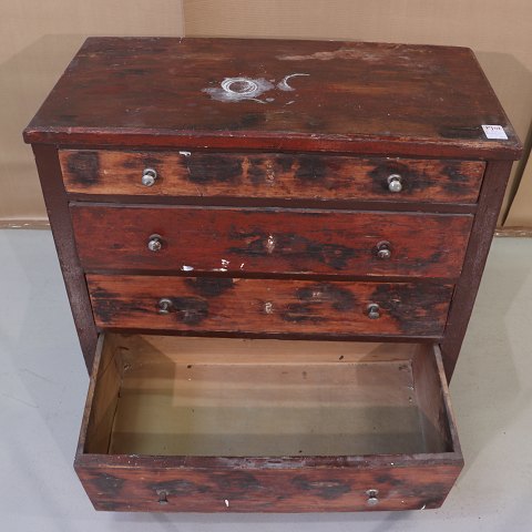 Kommode i bejdset fyrretræ m. 4 skuffer, OBS diverse defekter,
