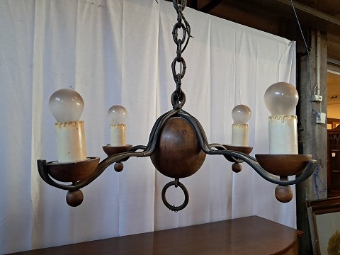 Lysekrone i smedejern og egetræ, fra 1930erne.