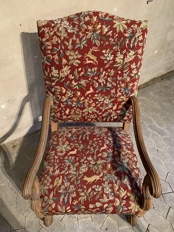 Armstol i massivt egetræ med broderet betræk, fra 1930erne.