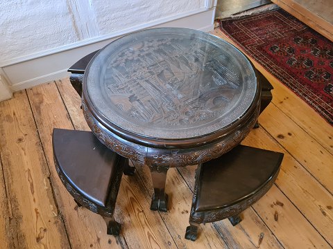 Orientalsk sofabord med 4 tilhørende skamler fra 1920´erne. Bordpladen har et rigt udskåret motiv og overliggende glasplade. Fremstår alt i alt pænt og velholdt uden nævneværdige brugsspor.