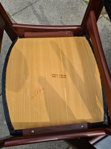 6 elegante spisebordsstole i teaktræ og sort læder. Fremstillet hos Frem Røjle møbelfabrik. Fremstår flotte og stabile med god patina.