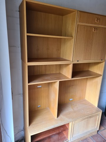 4 delt reolsektion i fineret egetræ, fra 1970erne.