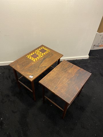 Indskudsborde i palisander og med kakler på det største. Fremstår pæne og velholdte uden nævneværdige brugsspor. OBS sættet består af 2 borde.