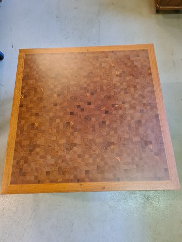 Mosaik sofabord i fineret teaktræ med massivt mosaik i flere træsorter, fra 1970erne.