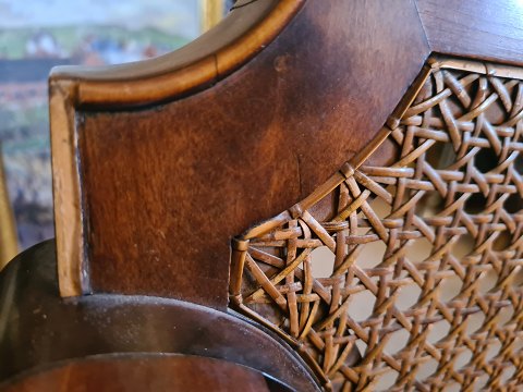 3 pers. bænk i birk med ryg i rørflet, udskæringer på armlæn og med velourbetrukket sæde. Svensk produceret i 1930'erne. Fremstår pæn, velholdt og udmærket stabil. Dog med brugsspor på sæde og manglende liste på ryg i venstre side. (Billede)