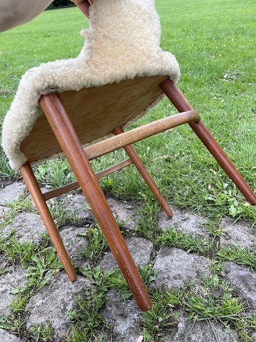 Sminkebordsstol polstret med lammeuld samt stel i teak. Udført hos Snedkermester Frode Holm ca. 1950'erne. Brugt stand, trænger til ombetrækning.