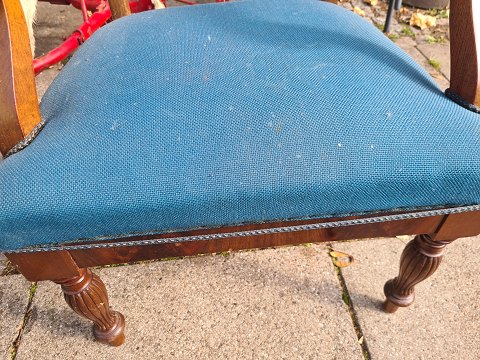 Armstol fra 1910´erne i mahogni. Fremstår pæn og udmærket stabil. Dog lettere tyndslidt på sædet med et løst kantbånd. (billede)