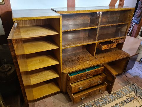 Funkis inspireret dækketøjsskab fra 1940'erne I birk og med glas skydelåger. Fremstår pænt, velholdt og udmærket funktionsdygtigt. Dog mangler en nøglehulskrans på skabsågen. (Billede)