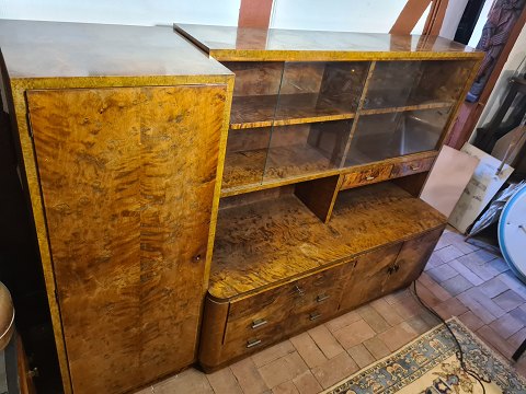 Funkis inspireret dækketøjsskab fra 1940'erne I birk og med glas skydelåger. Fremstår pænt, velholdt og udmærket funktionsdygtigt. Dog mangler en nøglehulskrans på skabsågen. (Billede)