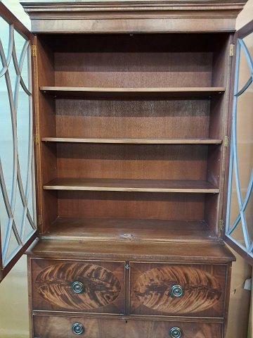 Engelsk skuffemøbel i fineret mahogni med vitrineoverdel, fra 1980erne.