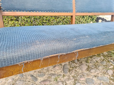 Dansk snedkermester bænk udført i bejdset egetræ betrukket med uld stof.