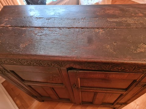 Antikt dækketøjsskab fra starten af 1800 tallet i eg. Fremstår godt og solidt med aldersrelaterede brugsspor på toppen.(billede) Umiddelbart uden nøgle.